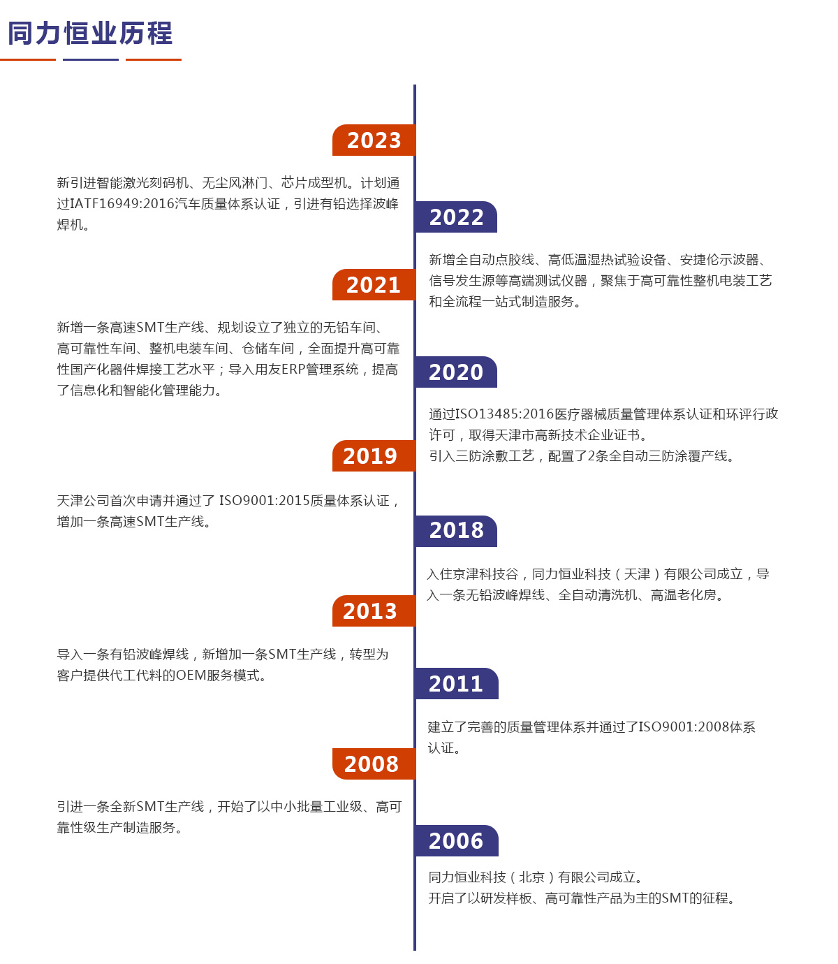 同力恒業(yè)科技成立于2006年,專業(yè)從事電子制造服務(EMS),專注于為客戶提供產品開發(fā)、工藝設計、物料配套、精密貼裝、插件焊接、三防涂敷、整機電裝、測試老化以及包裝運輸、售后維修等整個供應鏈解決方案。公司定位于高可靠性及中高端產品電子制造服務,在通訊導航、儀器儀表、醫(yī)療設備、汽車電子等領域具有豐富的一站式制造服務經驗。